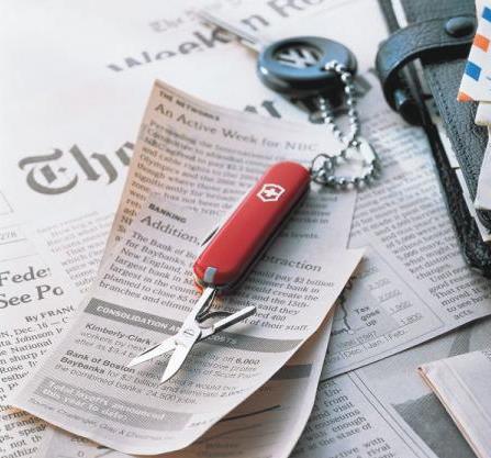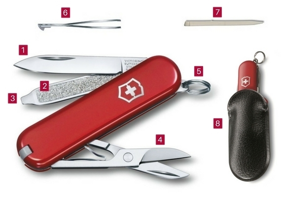rezilo, pilica za nohte, izvijač,škarje, obroč za ključe, pinceta, zobotrebec