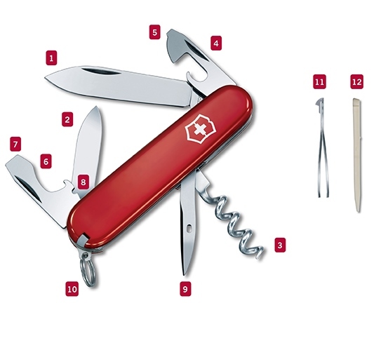 rezilo, majhno rezilo, odpirač za buteljke, odpirač za konzerve, mali izvijač, odpirač za steklenice, izvijač, lupilec žic, šilo, obroč za ključe, pinceta, zobotrebec